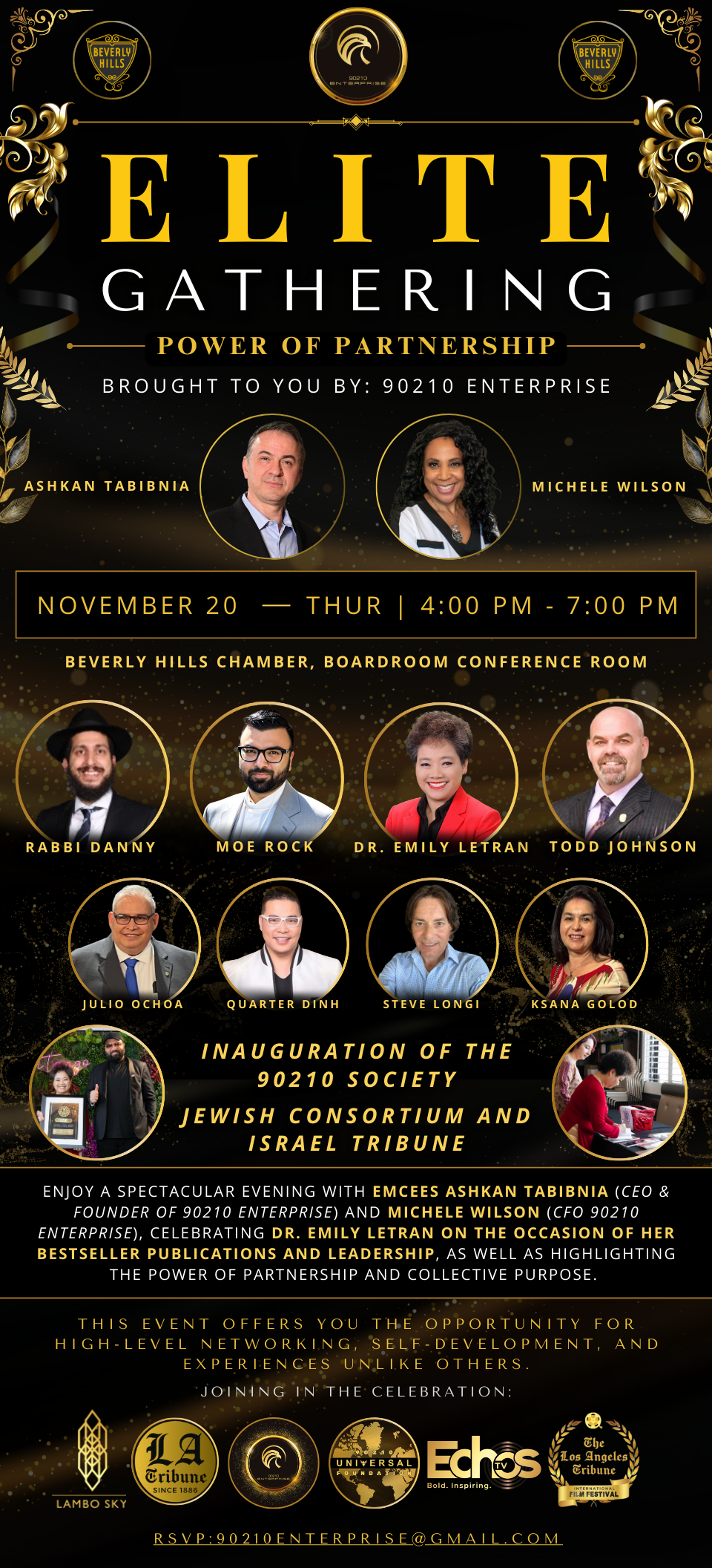 BEVERLY HILLS, CA, UNITED STATES, December 3, 2025 /EINPresswire.com/ -- The 90210 Elite Gathering: The Power of Partnerships convened distinguished leaders, innovators, and changemakers for a landmark evening highlighting global collaboration and purpose-driven alliances. The gathering was led by EMCEEs Ashkan Tabibnia, CEO & Founder of 90210 Enterprise, and Michele Wilson, CFO of 90210 Enterprise, alongside the full 90210 Enterprise team (Dr. Natalie Forest, President 90210 Enterprise, Dr Lester Bailey, CRO 90210 Enterprise, and Lesley Nase, CRO 90210 Enterprise), who collectively emphasized the extraordinary impact that aligned partnerships can have in strengthening communities and transforming the world.